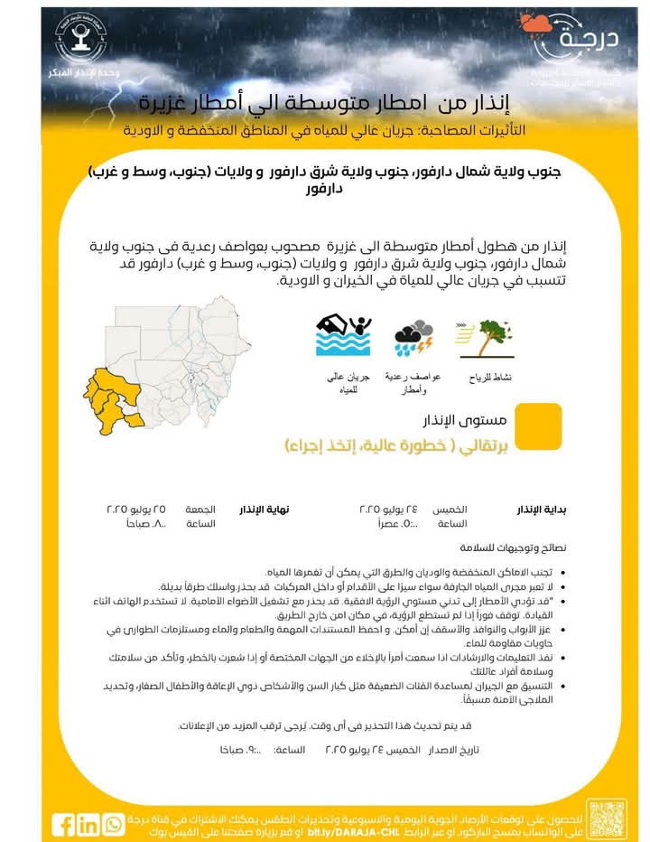 توقعت الهيئة العامة للأرصاد الجوية هطول امطار متوسطة إلى غزيرة مصحوبة بزوابع رعدية فى جنوب ولاية شمال دارفور، جنوب ولاية شرق دارفور و ولايات (جنوب، وسط و غرب) دارفور قد بسبب في جريان عالي للمياه في الخيران والاودية .