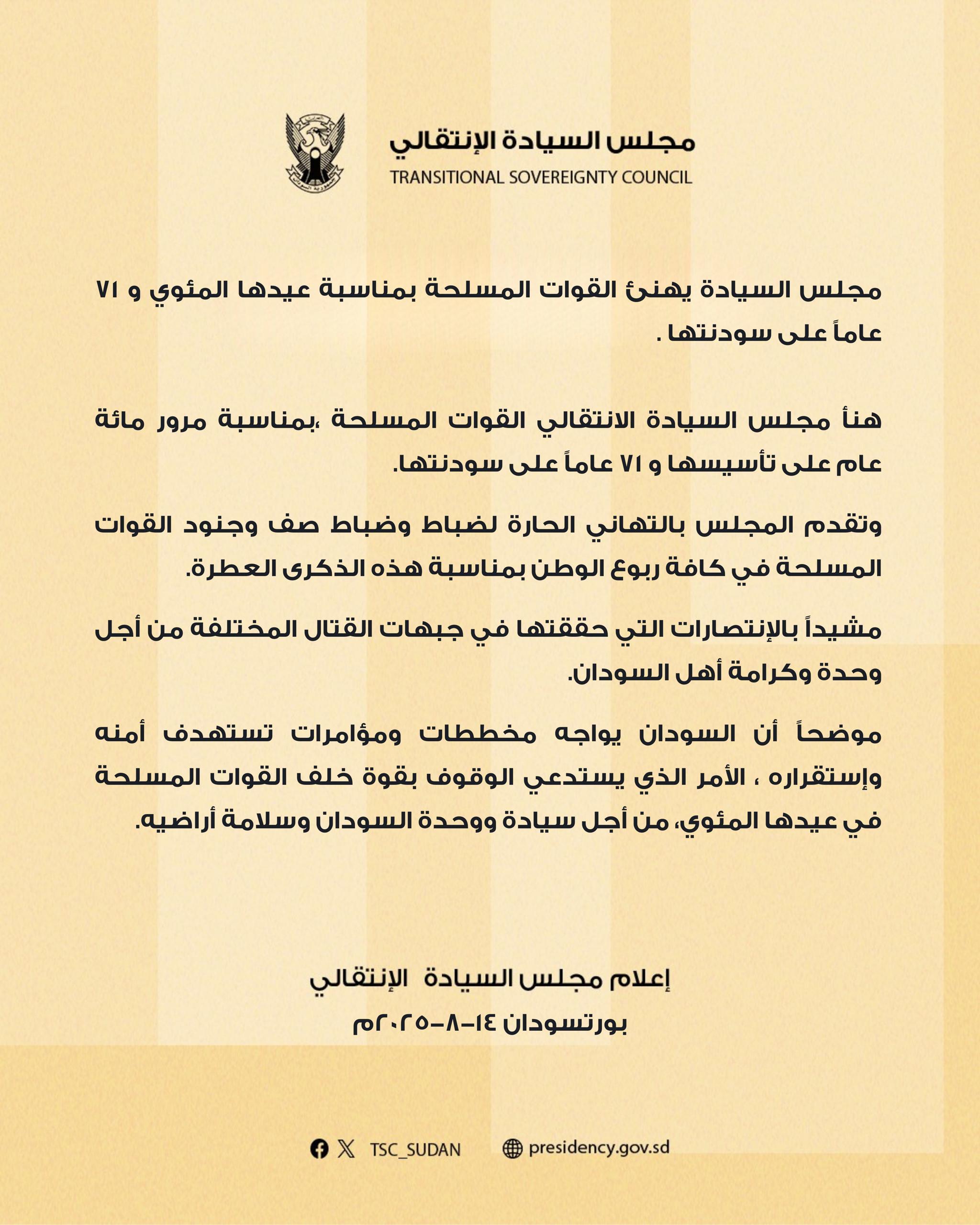 هنأ مجلس السيادة الانتقالي القوات المسلحة ،بمناسبة مرور مائة عام على تأسيسها و 71 عاماً على سودنتها.