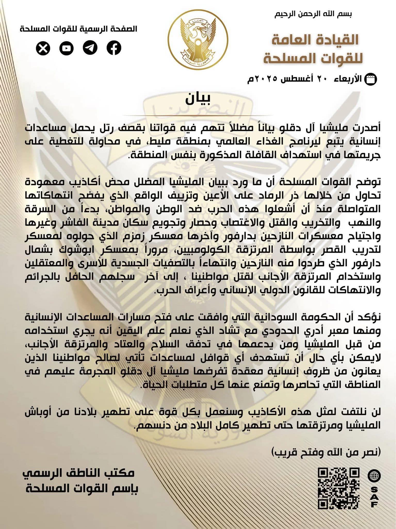 أصدرت مليشيا آل دقلو بياناً مضللاً تتهم فيه قواتنا بقصف رتل يحمل مساعدات إنسانية يتبع لبرنامج الغذاء العالمي بمنطقة مليط، في محاولة للتغطية على جريمتها في استهداف القافلة المذكورة بنفس المنطقة.