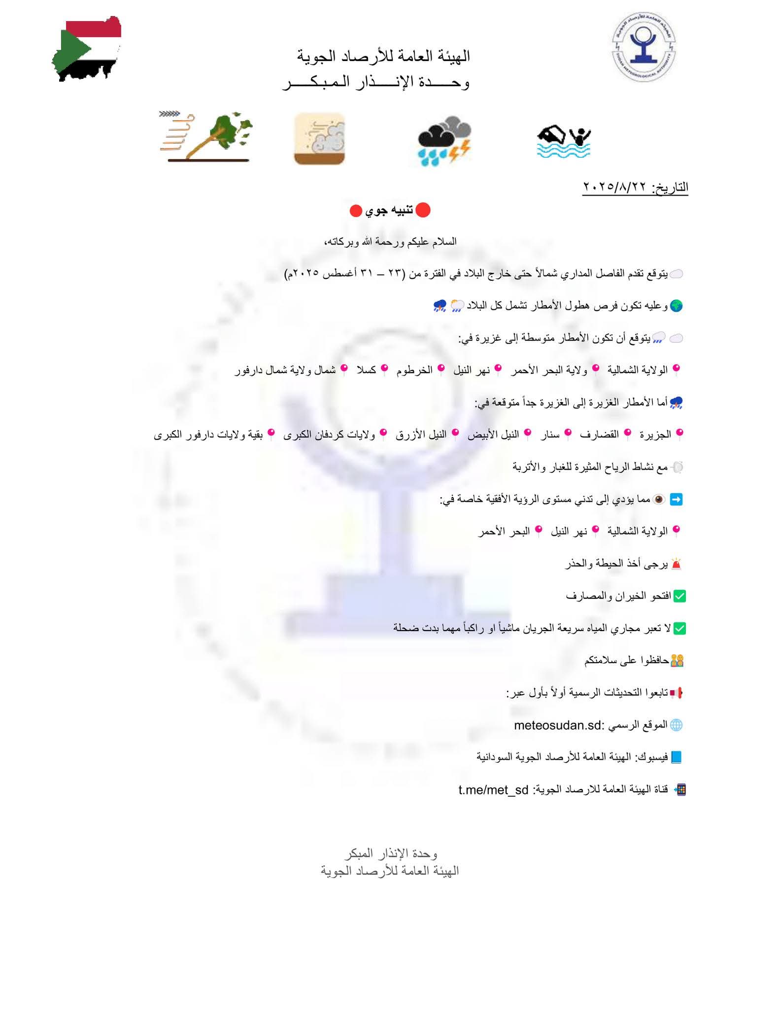 بينما يُنتظر أن تشهد ولايات: الجزيرة، القضارف، سنار، النيل الأبيض، النيل الأزرق، وكردفان الكبرى هطول أمطار غزيرة إلى غزيرة جداً.