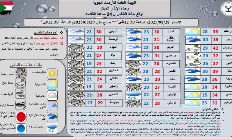 الطقس سيكون حارًا نهارًا ومعتدلًا ليلًا في ولايات الشمالية ونهر النيل والبحر الأحمر، ويميل إلى البرودة ليلاً في بقية الولايات.