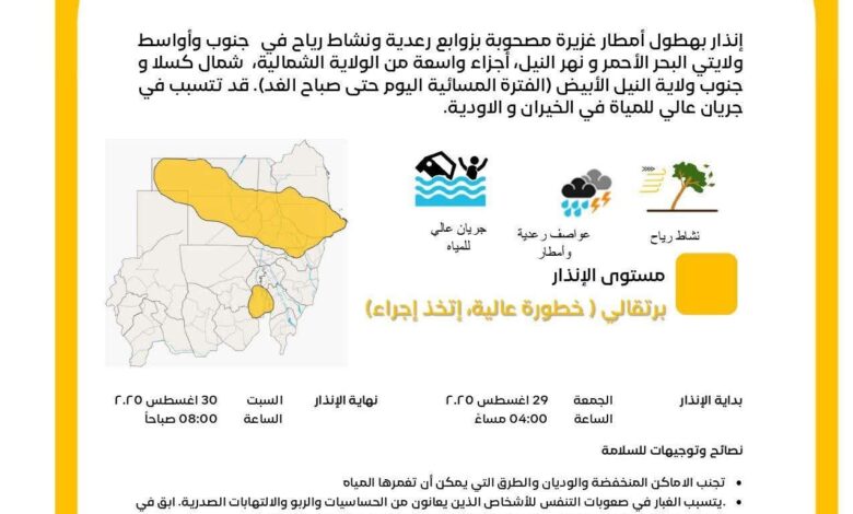 ويشمل التنبيه جنوب وأواسط ولايتي البحر الأحمر ونهر النيل، وأجزاء واسعة من الولاية الشمالية، إلى جانب شمال ولاية كسلا وجنوب ولاية النيل الأبيض.