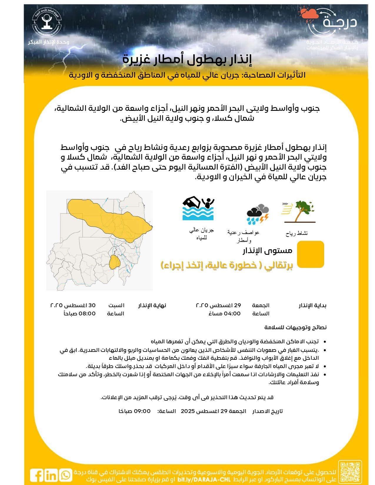 وأوضحت الوحدة أن مستوى التحذير وصل إلى اللون البرتقالي، ما يعني “خطورة عالية تستدعي اتخاذ إجراء”، داعية المواطنين لتجنب المجاري المائية الجارفة والطرق المعرضة للغمر، وعدم عبورها سيرًا أو بالمركبات، مع ضرورة الالتزام بالإرشادات الصحية أثناء موجات الغبار المصاحبة.