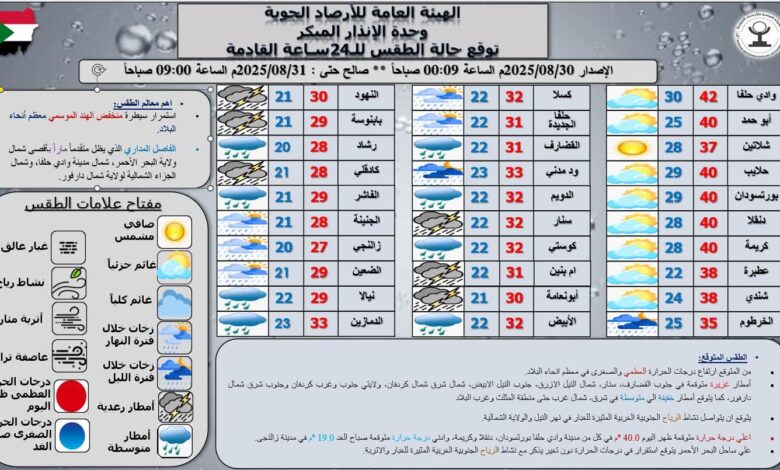 أما في توقعات الطقس لليوم، فمن المنتظر أن تشهد معظم أنحاء البلاد ارتفاعًا في درجات الحرارة العظمى والصغرى، حيث يُتوقع أن تسجّل مدن وادي حلفا، بورتسودان، دنقلا وكريمة 40.0°م ظهراً، بينما تُسجّل مدينة زالنجي أدنى درجة حرارة صباح الغد عند 19.0°م.