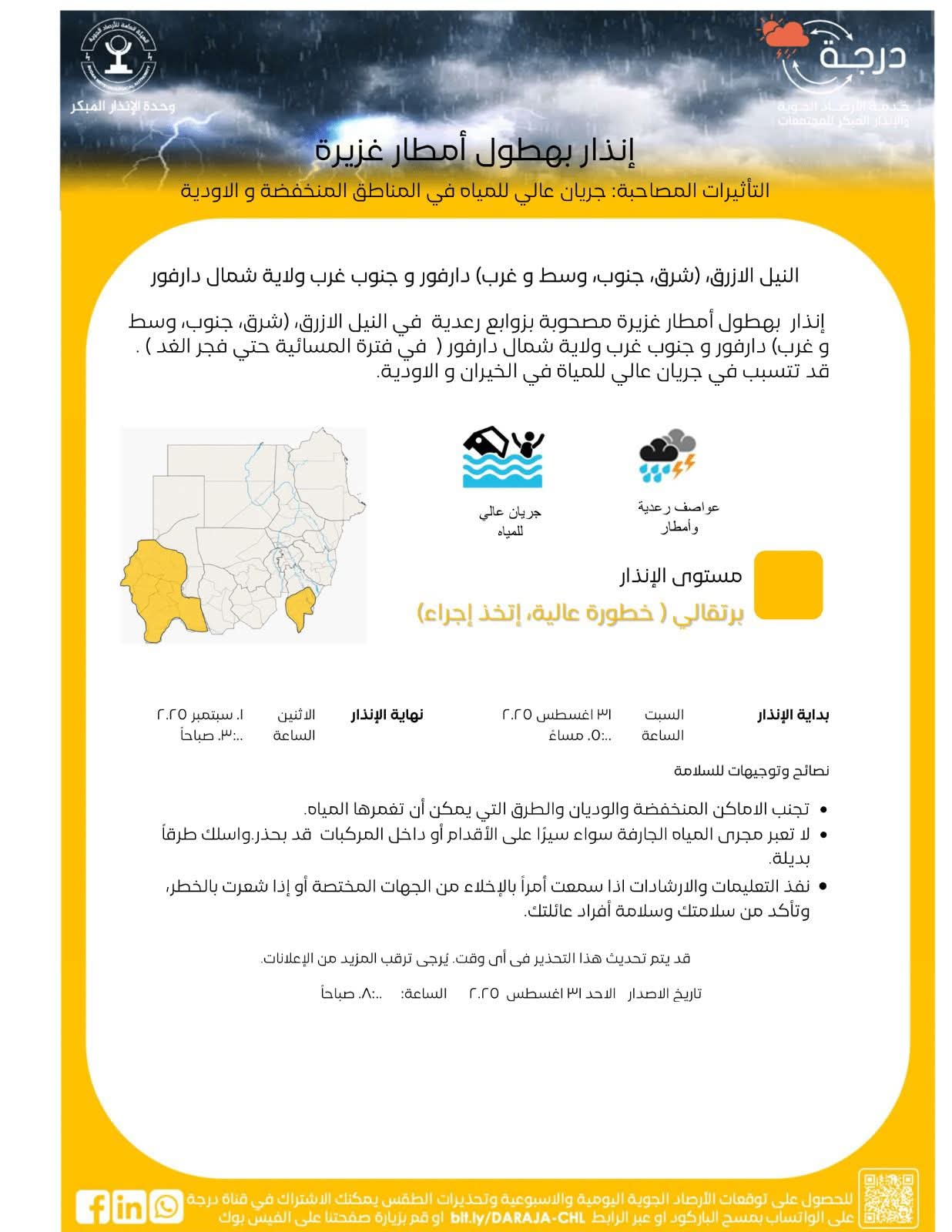 وبحسب التنبيه، تشمل المناطق المتأثرة: ولاية النيل الأزرق، وولايات دارفور (شرق، جنوب، وسط، غرب) بالإضافة إلى جنوب غرب ولاية شمال دارفور. وتشير التوقعات إلى احتمالية حدوث جريان عالٍ للمياه في الأودية والخيران والمناطق المنخفضة نتيجة غزارة الأمطار.