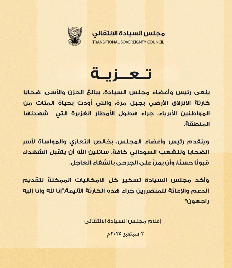 ينعى رئيس وأعضاء مجلس السيادة، ببالغ الحزن والأسى، ضحايا كارثة الانزلاق الأرضي بجبل مرة، والتي أودت بحياة المئات من المواطنين الأبرياء، جراء هطول الأمطار الغزيرة التي شهدتها المنطقة.