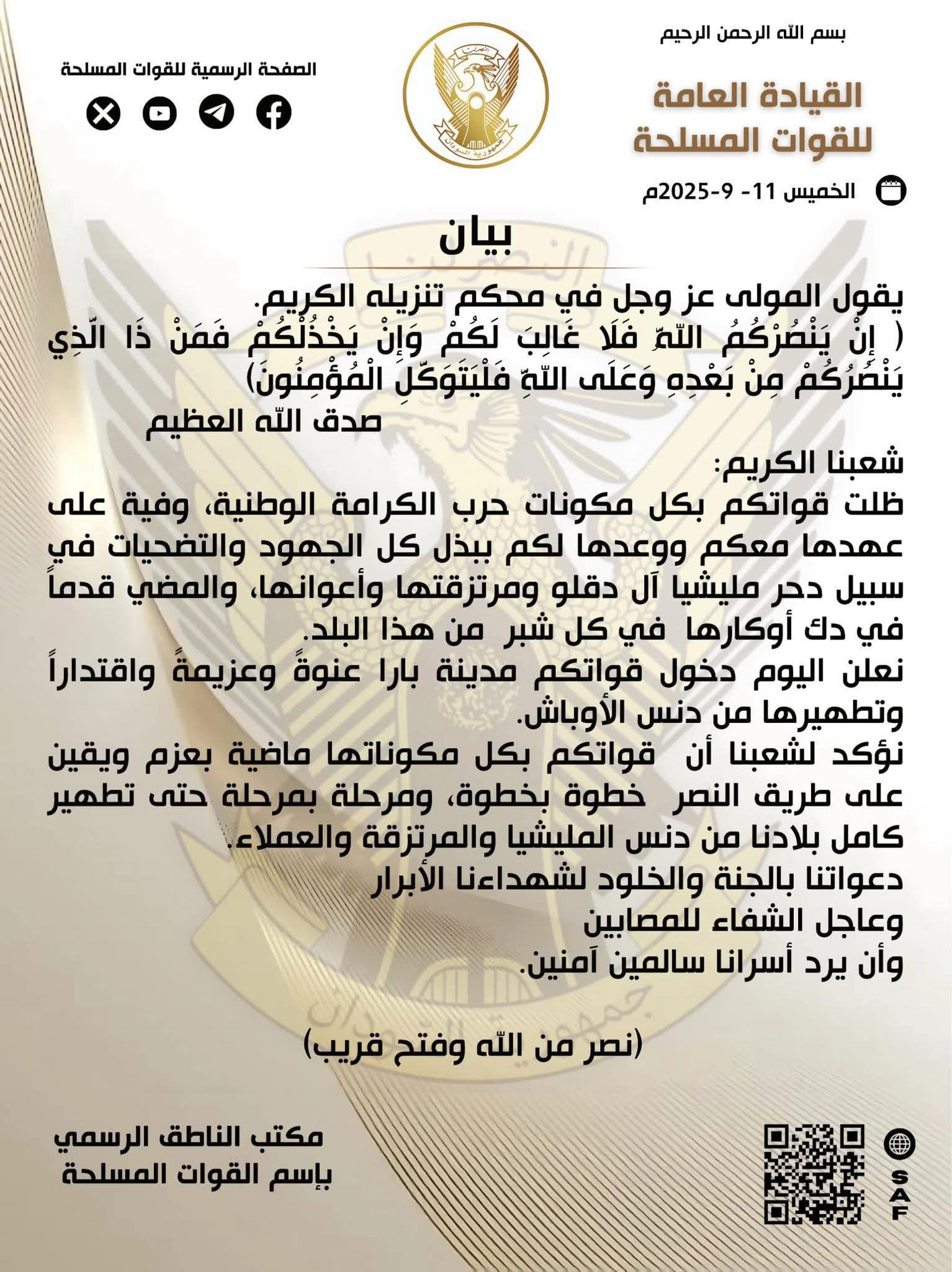 أعلنت القوات المسلحة اليوم دخول مدينة بارا عنوةً وعزيمةً واقتداراً وتطهيرها من دنس الأوباش.