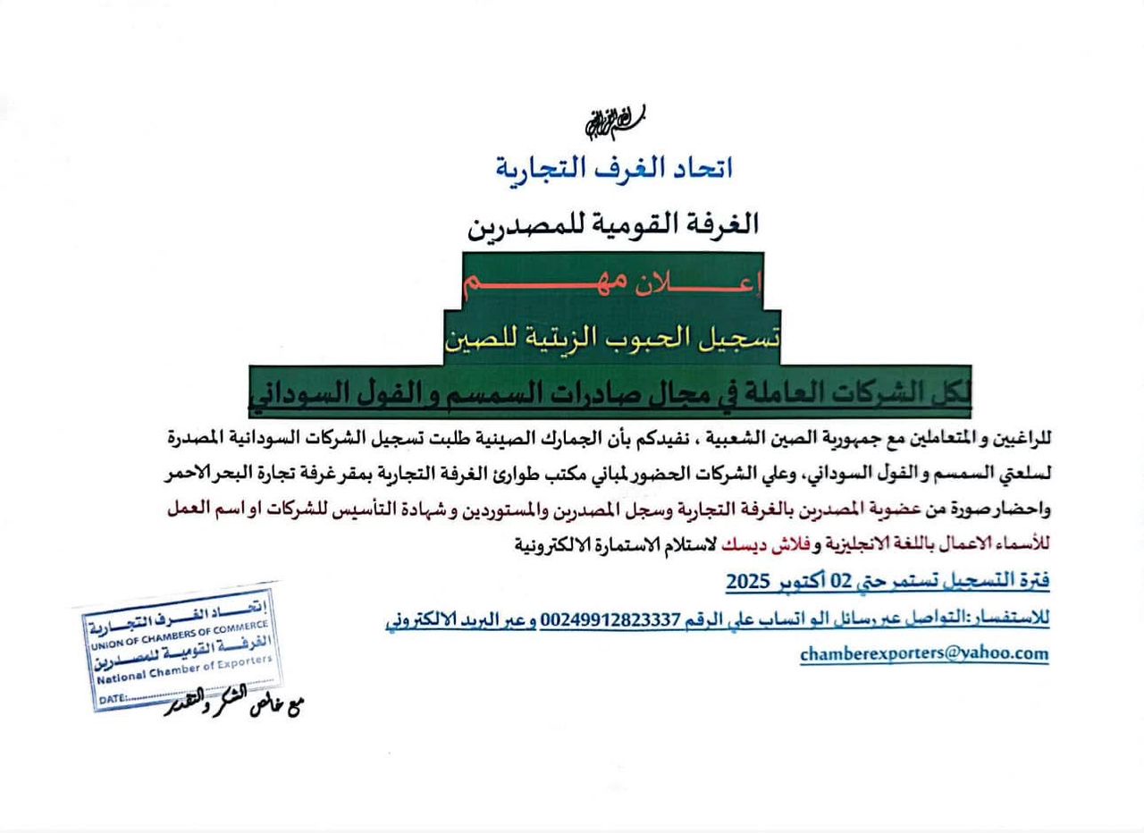 تمديد فترة التسجيل لشركات الصادر السودانية لدي الجمارك الصينية لسلع السمسم السوداني و الفول السوداني و الزيوت , حتي تاريخ 02 اكتوبر 2025