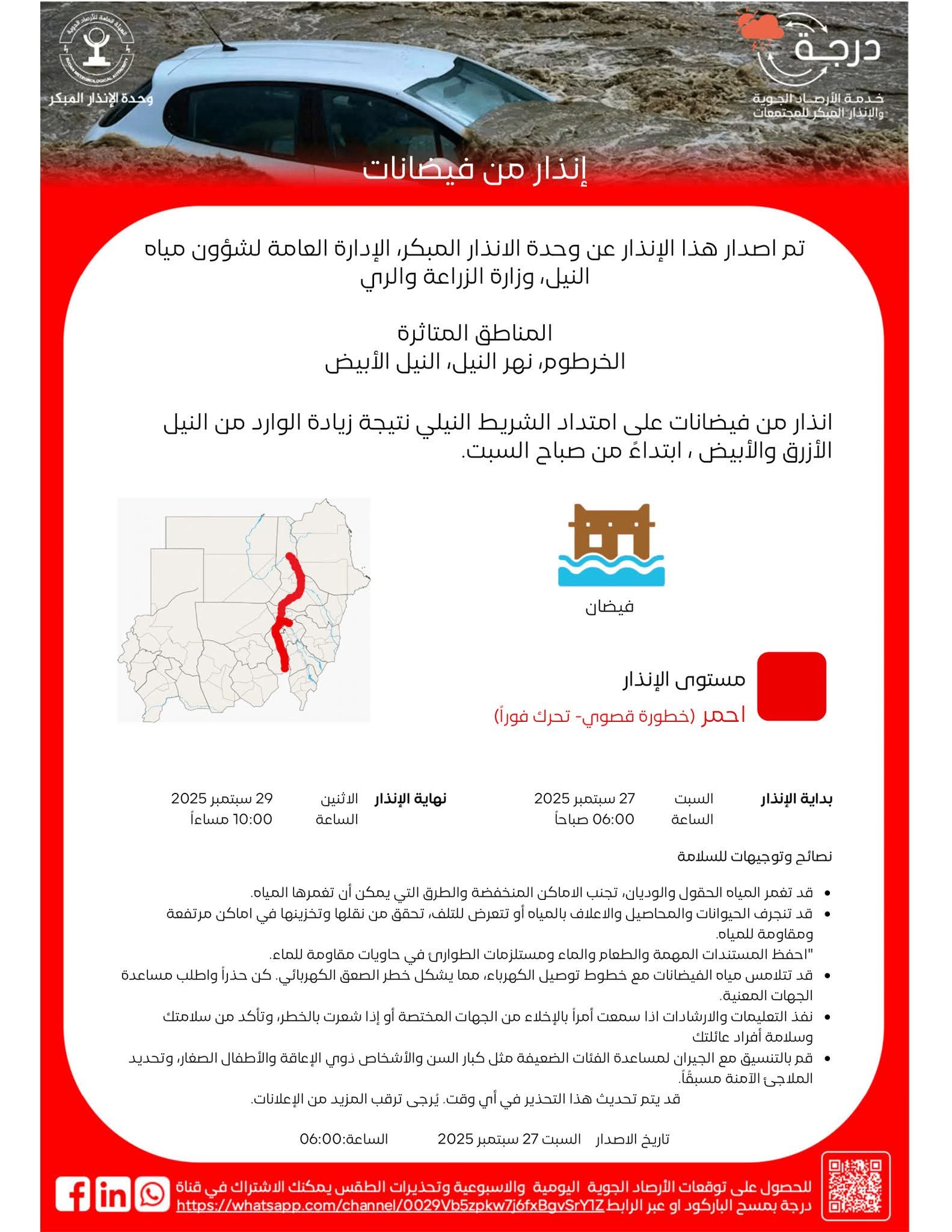أصدرت وحدة الإنذار المبكر بالإدارة العامة لشؤون مياه النيل – وزارة الزراعة والري، إنذارًا أحمر (خطورة قصوى – تحرك فورًا) بشأن فيضانات متوقعة على امتداد الشريط النيلي نتيجة زيادة الوارد من النيلين الأزرق والأبيض، وذلك ابتداءً من السبت 27 سبتمبر 2025 في تمام الساعة 06:00 صباحًا وحتى الاثنين 29 سبتمبر 2025 الساعة 10:00 مساءً.