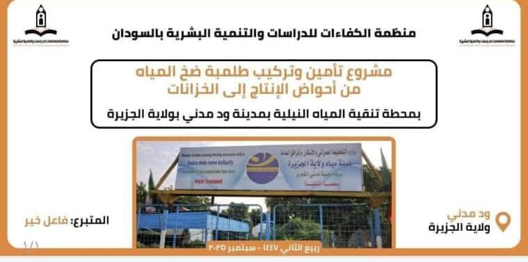 امتدح مدير عام وزارة المالية ومدير عام هيئة المياه بولاية الجزيرة، بالدور الكبير الذي تقوم به منظمة الكفاءات للدراسات والتنمية البشرية في دعم مشروعات سقيا المياه بالولاية، وذلك خلال تدشين مشروع تأهيل محطة تنقية المياه النيلية بمدينة ود مدني.