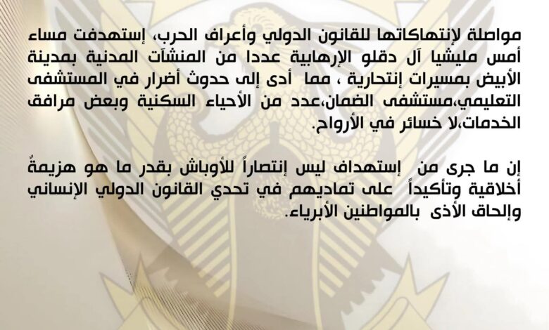 ووصفت القيادة العامة في بيانها ما جرى بأنه “هزيمة أخلاقية” لمليشيا الدعم السريع، مؤكدة أن هذا الاستهداف يعكس تماديها في تحدي القانون الدولي الإنساني وإلحاق الأذى بالمواطنين الأبرياء.