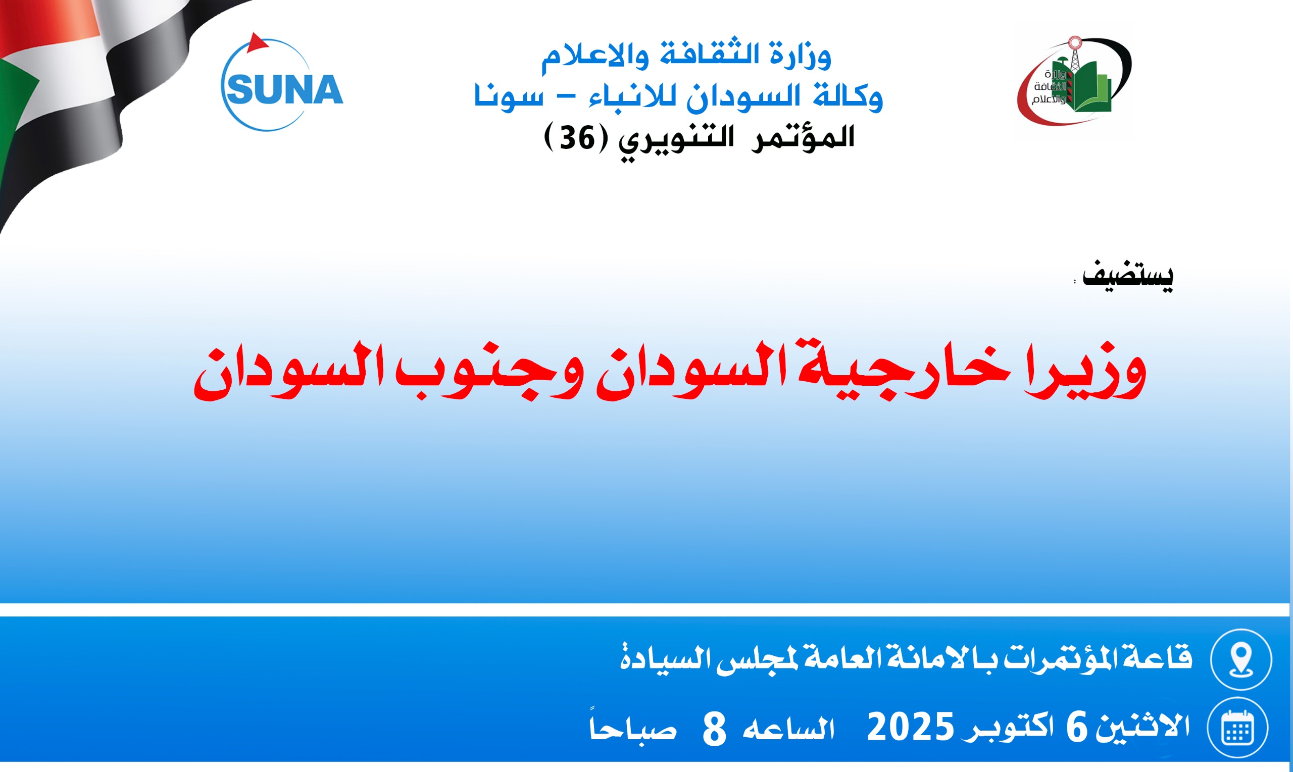 يستضيف المؤتمر التنويري رقمً (٣٦) لوزارة الثقافة والإعلام والسياحة، الذي تنظمه وكالة السودان للأنباء، وزيرا خارجية السودان وجنوب السودان.