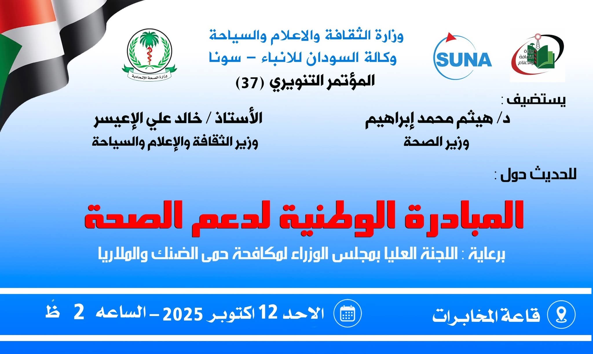 يستضيف المؤتمر التنويري رقم (37) لوزارة الثقافة والإعلام والسياحة الذي تنظمه وكالة السودان للأنباء، في تمام الثانية من ظهر غد الاحد الموافق 12 اكتوبر 2025م، وزير الصحة الدكتور هيثم محمد إبراهيم، ووزير الثقافة والإعلام والسياحة الأستاذ خالد الإعيسر .