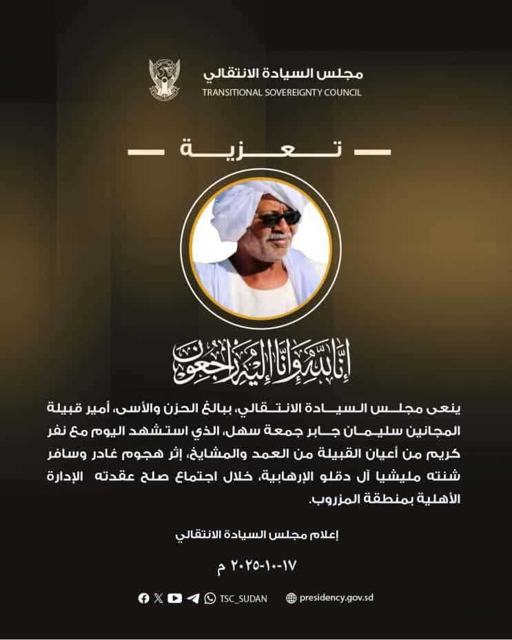 ينعى مجلس السيادة الانتقالي ببالغ الحزن والأسى، أمير قبيلة المجانين سليمان جابر جمعة سهل، الذي استشهد اليوم مع نفر كريم من أعيان القبيلة من العمد والمشايخ، إثر هجوم غادر وسافر شنته مليشيا آل دقلو الإرهابية، خلال اجتماع صلح عقدته الإدارة الأهلية بمنطقة المزروب.