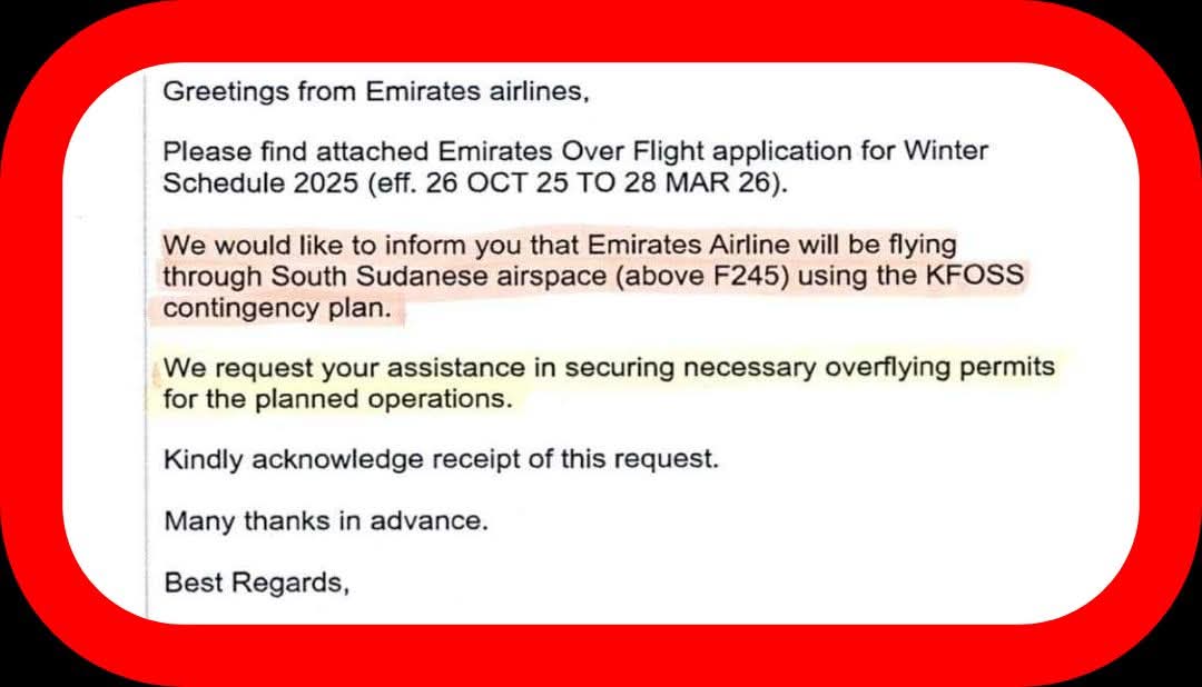 ■ مما علمته أيضًا أن مدير عام سلطة الطيران المدني السوداني خاطب الجهات العليا في الدولة وأرفق مع خطابه الطلب الرسمي الذي تقدمت به شركة طيران الإمارات لعبور أجواء جنوب السودان..