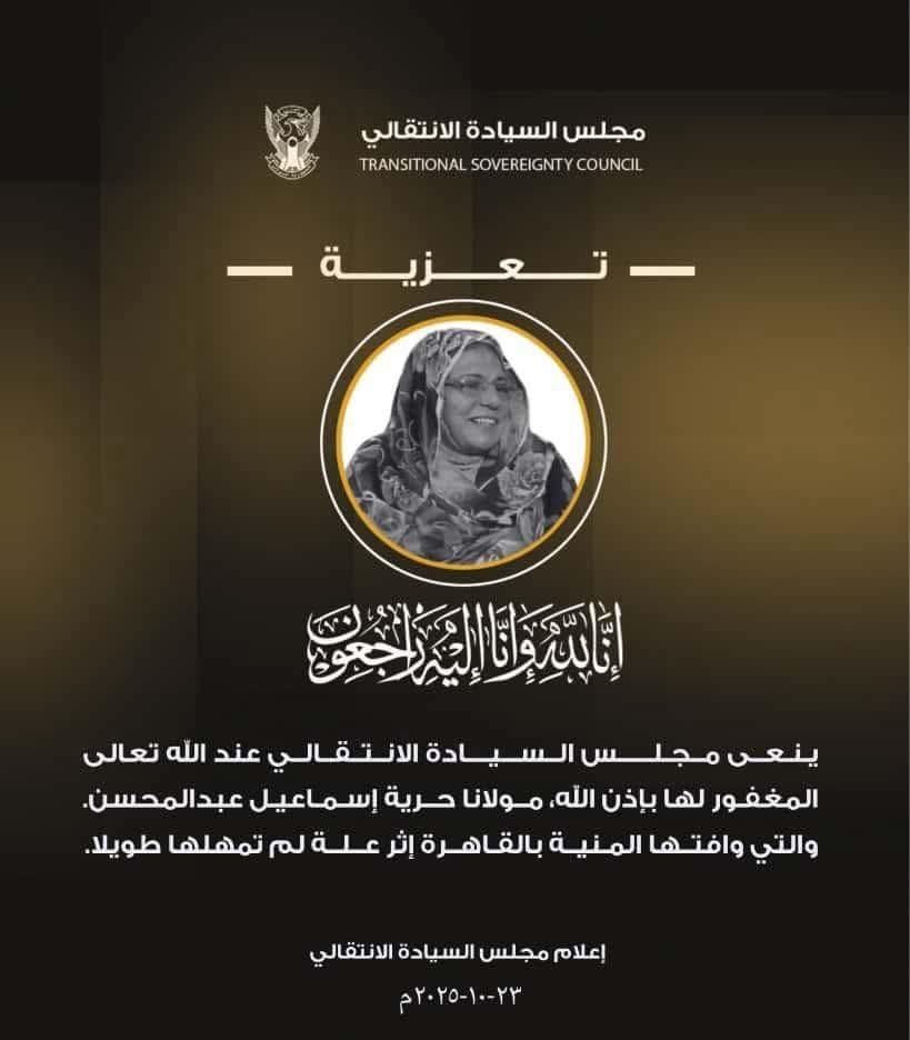 مجلس السيادة الانتقالي ينعى حرية إسماعيل عبدالمحسن
