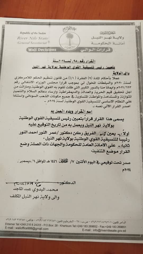 أصدر والي نهر الني الدكتور محمد البدوي عبدالماجد قرارا عين بموجبه الفريق الركن الدكتور عمر النور أحمد النور رئيسا لتنسيقية القوى الوطنية بالولاية.