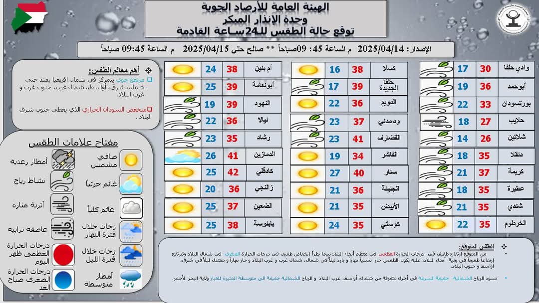 أعلى درجة حرارة متوقعة ظهر اليوم 42.0 في مدينة كادقلي وأدني درجة حرارة متوقعة صباحالغد 14.0 م في مدينة شلاتين.
