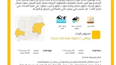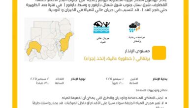 ريام نيوز ١ سبتمبر ٢٠٢٥م أصدرت وحدة الإنذار المبكر بالهيئة العامة للأرصاد الجوية اليوم الإثنين إنذارًا باللون البرتقالي (خطورة عالية…