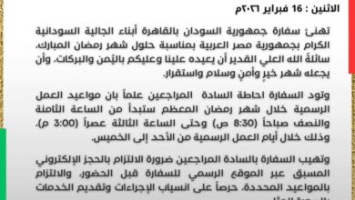 متابعات : ريام نيوز أعلنت سفارة جمهورية السودان بالقاهرة تعديل ساعات العمل الرسمية خلال شهر رمضان المعظم، مهنئة أبناء الجالية…