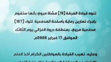 متابعات : ريام نيوز أعلنت قيادة الفرقة (19) مشاة مروي تنفيذ تمارين رماية بالمدفعية، ودعت المواطنين إلى توخي الحيطة والحذر…